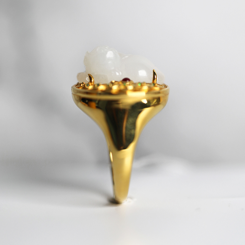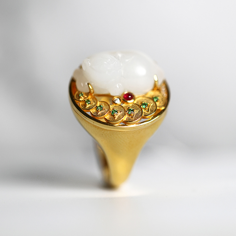 玉雕瑞兽匍匐金币之上,取“金玉满堂,珠玑盈斛”之吉兆