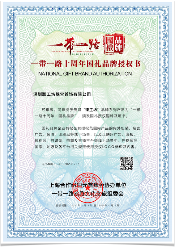 在由上海合作组织元首峰会协办单位——一带一路丝路文化之旅组委会等机构共同发起的“一带一路十周年·国礼品牌”评选活动中,臻工坊珠宝成功入选“一带一路十周年·国礼品牌”,这不仅是对臻工坊在一带一路建设中所贡献的工匠精神之认可,也是对品牌坚持以臻工品质为核心的发展方向给予肯定,为世界呈现了中国玉文化的自信和魅力。
